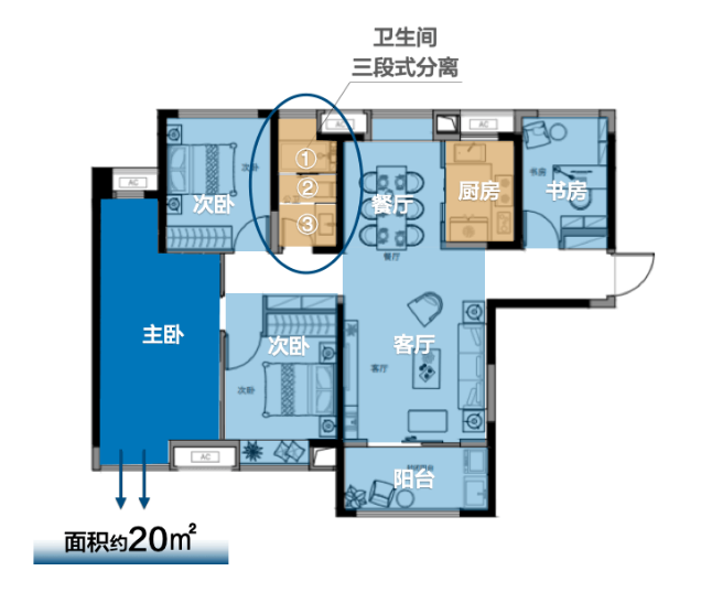 两个卫浴间都采用三段式分离设计,是适应多家庭成员的较好解决方案。两个封闭阳台和三个飘窗,加起来多出约10㎡物理面积,让尺度再上一层。