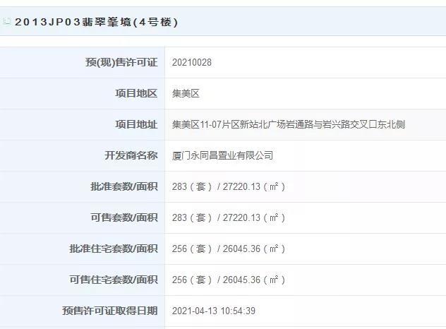 位于集美北站片区的2013JP03翡翠峯境项目256套住宅预售获批!