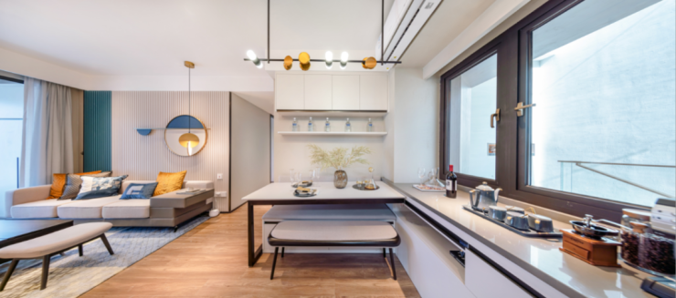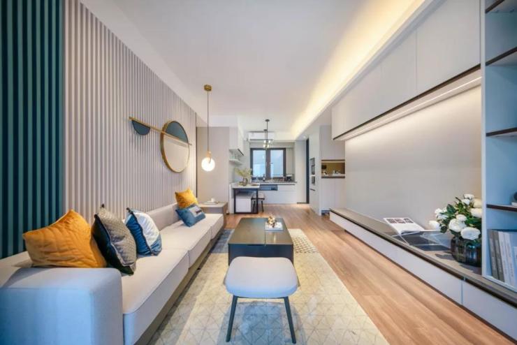入户之处定制玄关柜,采用三段式功能设计,将有限空间充分利用;南向270°瞰景阳台,将客厅空间与室外景观巧妙联动,让视线无限延伸,四开间布局匠呈理想居所,演绎湾区生活美学。