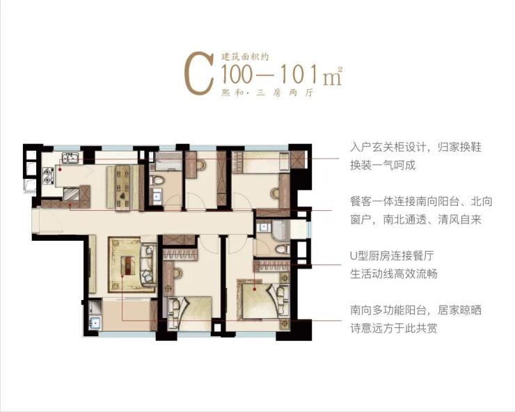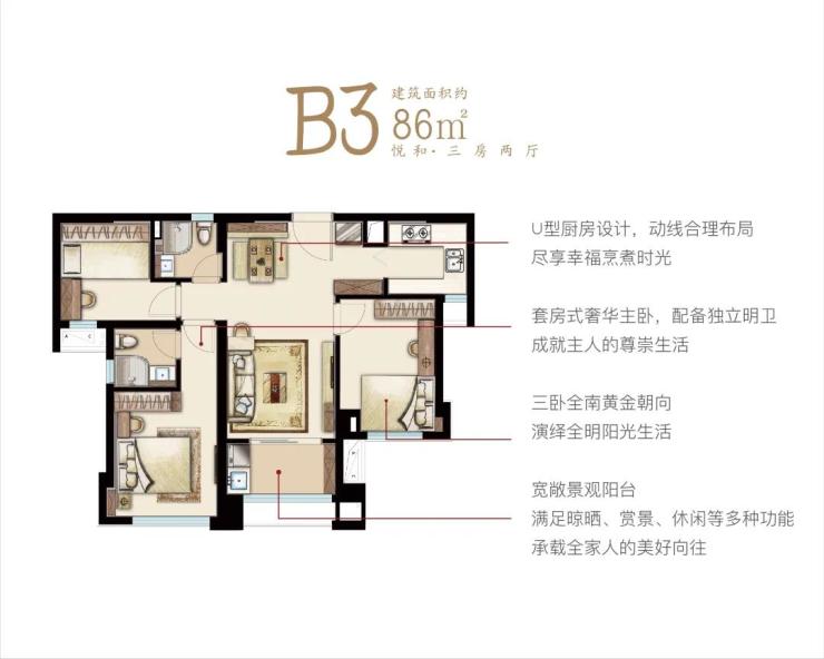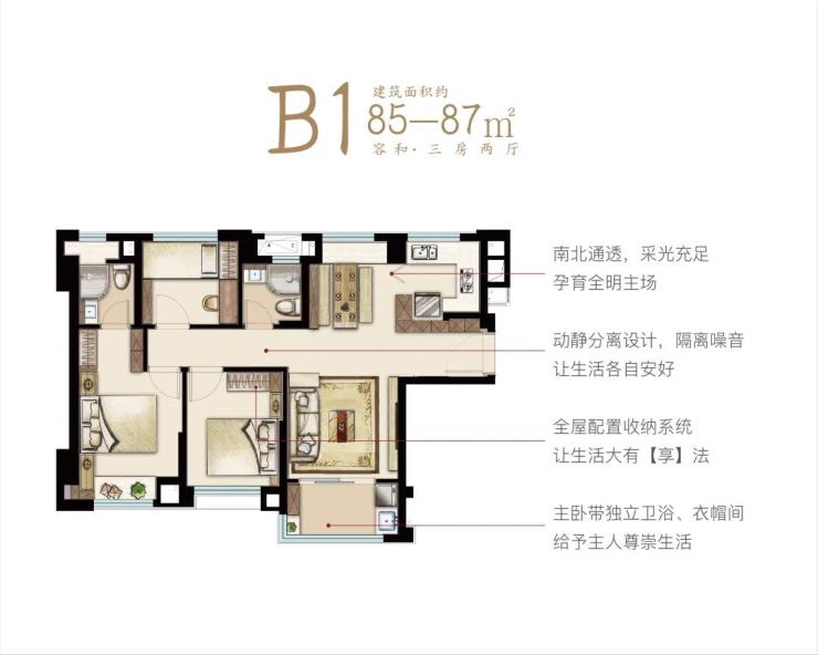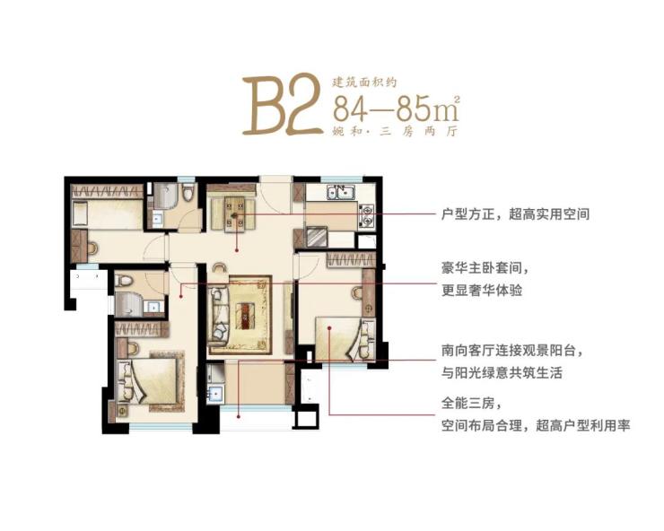 海玥和鸣近期劲销的建面约85㎡全能户型,更是将精致、华丽的人居理念于细节中彰显,三房两厅两卫有颜又有范。