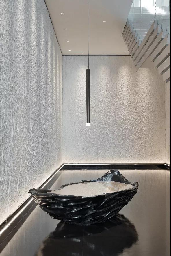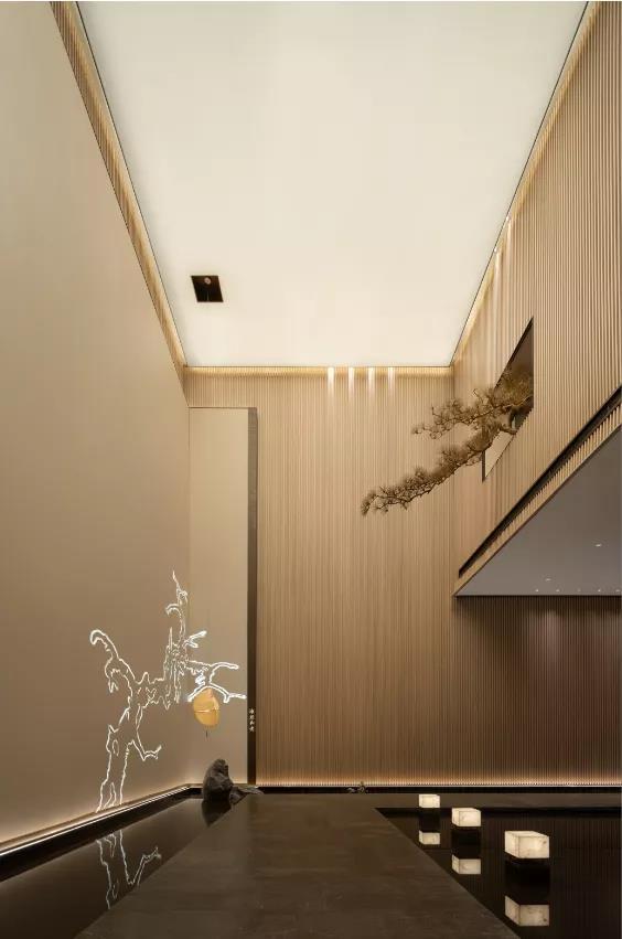 一遇和鸣,入口前厅以自由流动的游园布局,与室外园林内外圆融,水流绕庭,曲径通幽,水木清华,虚实互映,构筑一方清雅宁静的室内山水意境。