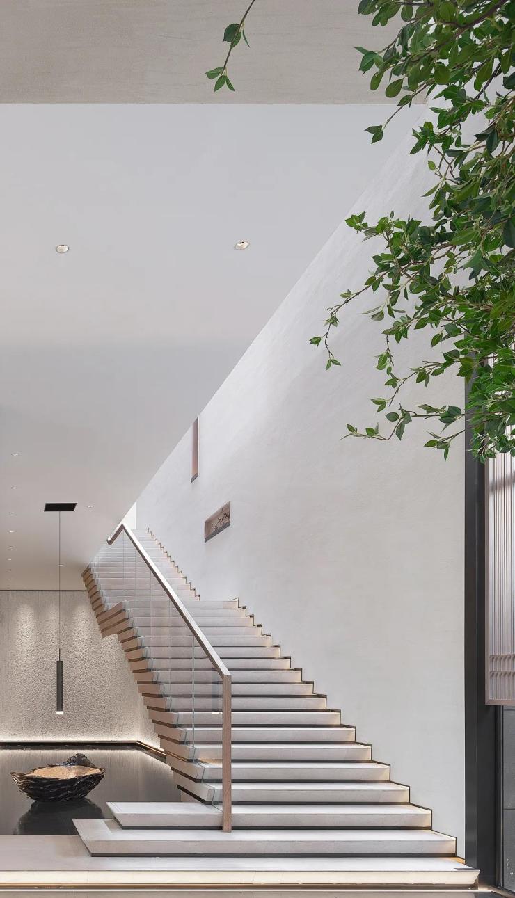 环顾和鸣,建筑顶部在采光上运用虚实荫翳的设计手法,阶梯的几何结构张弛有力,空间的留白与光影的映耀,凝练了力与美。天光云影,透过玻璃幕墙,水天相映,一草一林、飞檐流瀑,丰富的自然元素相互碰撞,融入现代更具开放视野的空间特质中,优质营造出“竹中雅境望繁花”的空间意境。