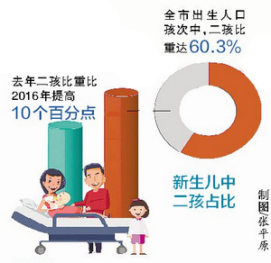 调查数据显示,全市出生人口的孩次构成中,二孩比重高达60.3%,超过一孩比重24个百分点,同时也比2016年大幅提高10个百分点。不过,随着生育二孩热情的全面释放,预计今后几年的生育水平将有所回落,逐步回归至往年的正常水平。