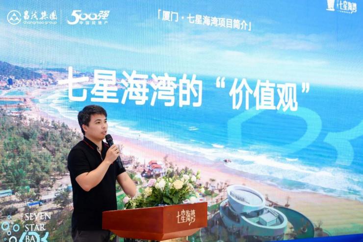 致辞完毕后,七星海湾项目销售负责人张慧勇先生,为现场来宾介绍七星海湾项目的整体规划和集团斥巨资为七星海湾未来业主打造的7维生活价值体系,以“亲海度假、生态体验、休闲农场、国际教育、风情商街、酒店商业、康养中心”七大配套产业,构筑起完善的人居价值系统。