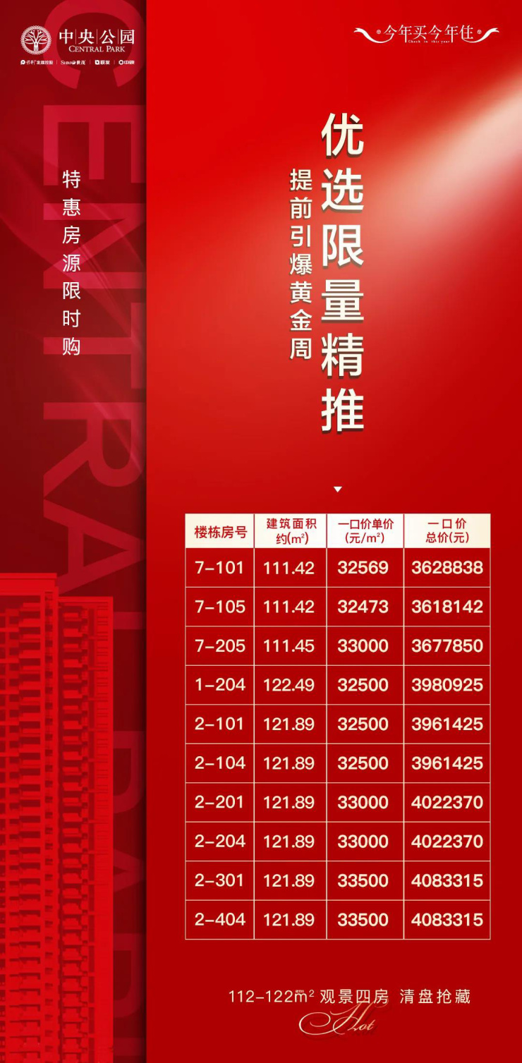 厦门中央公园,今年买今年入住,美好不用等。目前建面约112-122㎡观景四房即将清盘,房源逐席减少,趁着五一假期,看中赶紧下手吧!