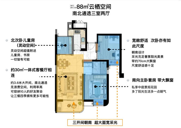 建筑面积约88㎡南北通透的舒适采光,餐客厅一体尽享宽敞的空间格局。同时次卧的灵动空间,能创造更多生活场景,它可以是享受亲子时光的儿童活动区,也可以是看电影、打电动的游戏屋。卫生间三段式分区空间规划,让家人洗漱、沐浴、如厕互不干扰,精琢的细节满足一家人的舒适生活。