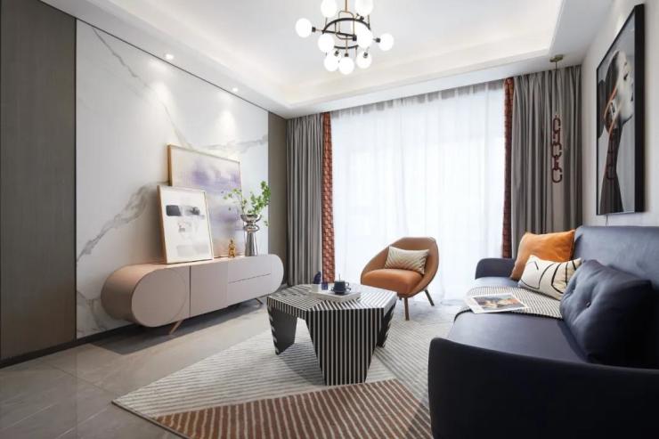 客厅以大胆的宝石蓝、珊瑚橙结合几何线条元素碰撞出更多可能性,软装在空间中构造映射居住日常的充实和情感的丰富,色彩和线条的构成,色彩的碰撞,交织的光影,展示现代前卫的都市生活。