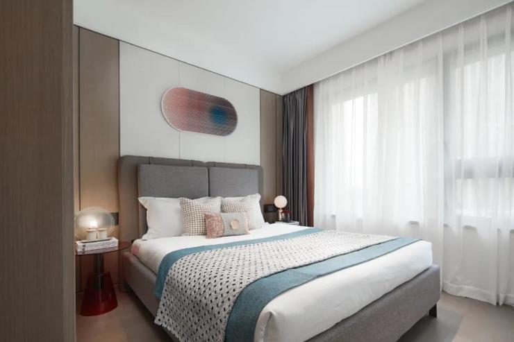 主卧入口处的摆放几何黑白条纹边柜,配上精致的挂画及花艺,将时尚与复古优质结合。卧室以低饱和撞色的搭配,点缀炫彩的艺术装置,荡漾在空间中,动静有序,让人有如置身于超现实的梦境中,让居者负重前行的身体与灵魂得到彻底的放松。