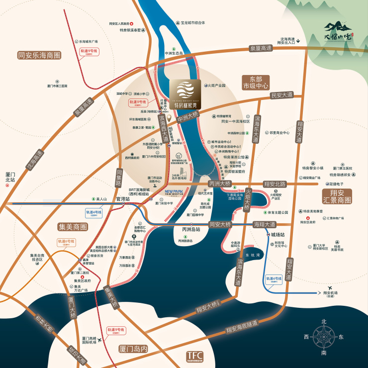 环东海域新城作为厦门未来中心,坐拥枢纽交通体系,5路5桥1隧纵横交通,翔安大道、滨海东大道、滨海西大道、同集路、海翔大道五大主干道畅行;集美大桥、翔安大桥、同安大桥、丙洲大桥、中洲大桥五桥鼎立;地铁4/9号线(在建中),串联同安老城区和厦门岛,接驳厦门北站、高崎机场,快速通连厦漳泉闽金三角城市群。