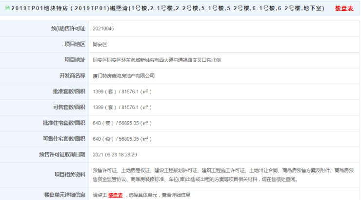 2019TP01地块特房(2019TP01)樾熙湾(1号楼,2-1号楼,2-2号楼,5-1号楼,5-2号楼,6-1号楼,6-2号楼,地下室)获批预售!该项目位于同安区环东海域新城滨海西大道与通福路交叉口东北侧,此次获批预售1399套,面积81576.1㎡;其中获批预售住宅640套,面积56895.05㎡。