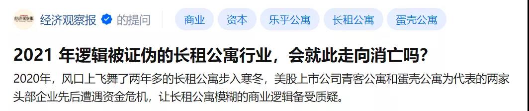 近日,《经济观察报》官方号在知乎上提出疑问:“2021年逻辑被证伪的长租公寓行业,会就此走向消亡吗?”