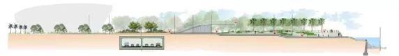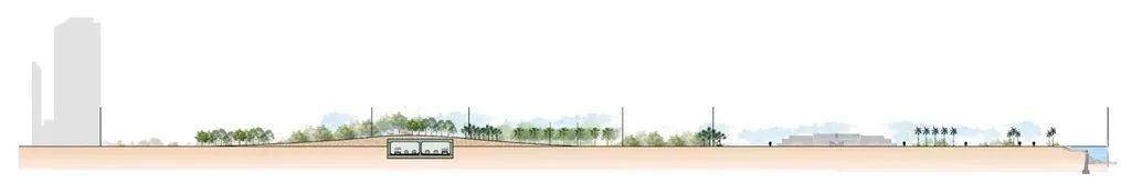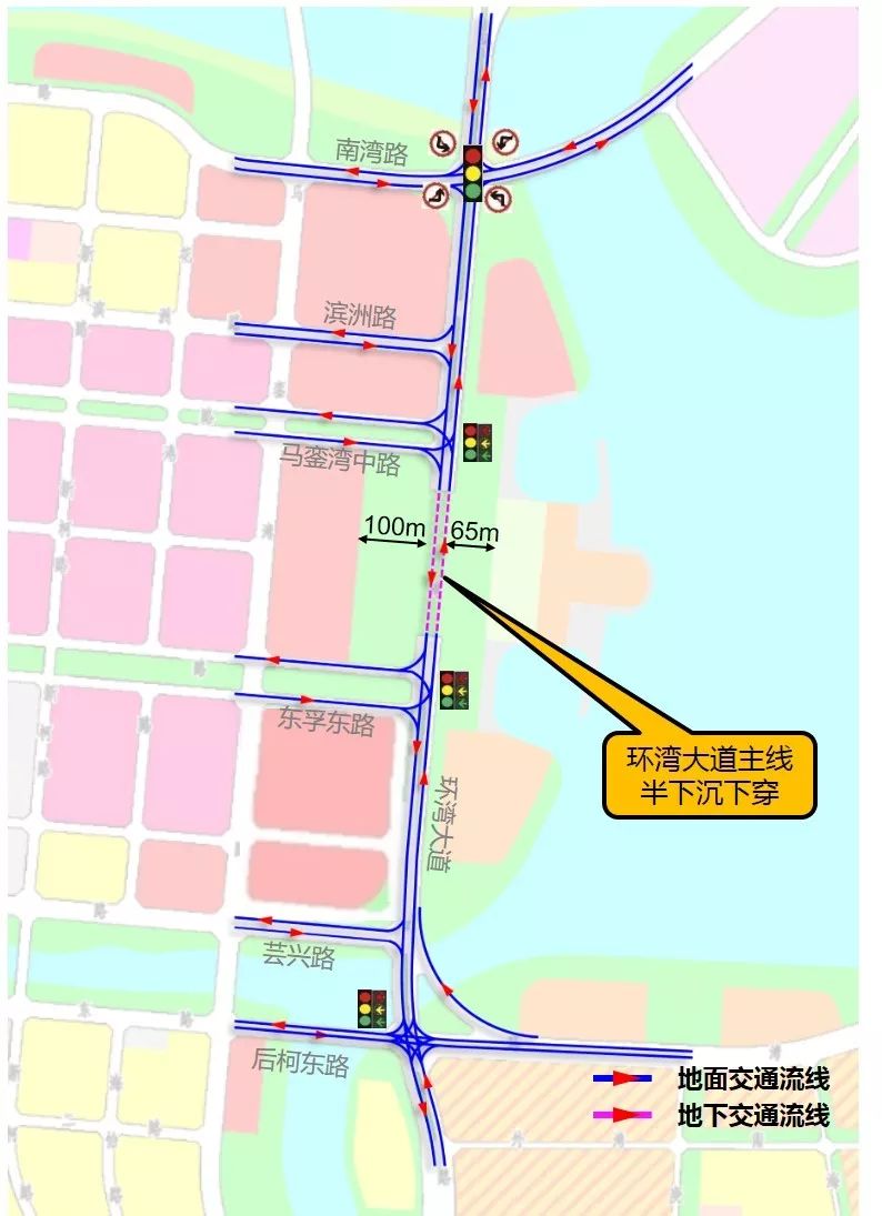《规划》提出东西向景观带跨道路区域整体抬高,环湾大道主车道双向八车道半下沉形式下穿东西向景观带,与马銮湾中路、东孚东路形成信号灯控口,实现与相交路网的交通转换。