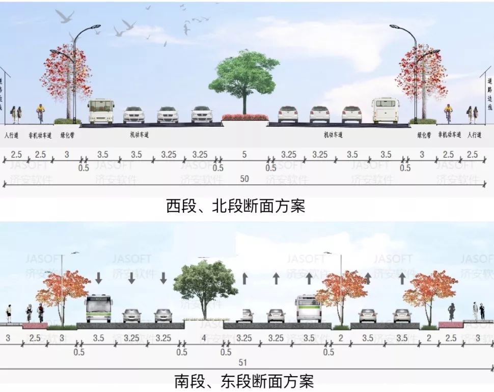 按照满足车辆和行人交通畅通性、安全性及舒适性的要求,重点考虑整体景观效果,统筹道路绿化、景观布置的规划原则,将道路标准横断面规划为主线双向八车道,并设置5m宽中分带。