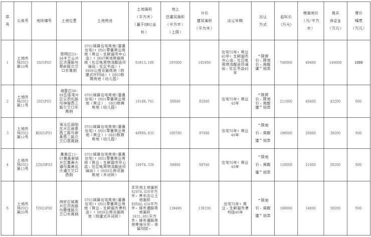 厦门2021年首场土拍,将拍的5幅地块已经爆出,将于2021年5月13日分两场举行,上午拍卖思明区2021P02地块、湖里区2021P03地块、海沧区H2021P01地块,开始时间为9:30。下午拍卖集美区J2020P03地块、同安区T2021P02地块,开始时间为14:30。这五块地块究竟会花落谁家呢?尽情期待!