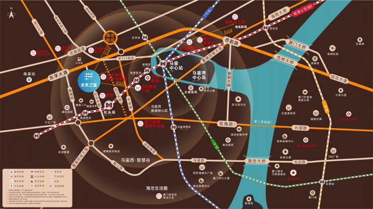 ▪本项目推广名为:未来之城,由宗地台2020P05、台2020P06组成06地块商品房预售证号<2021>台房预售证第006号05地块 商品房预售证号<2021>台房预售证第007号,其中台2020P05地块备案名为:都会之光南区,开发商为:”漳州金光嘉旭房地产开发有限公司“;台2020P06地块备案名为:都会之光北区,开发商为:”漳州金昇顺房地产开发有限公司“。▪ 马銮西指漳州台商投资区。智慧谷代指厦门海沧至台商投资区产业项目,包含软件园四期、国贸智谷等。▪ 本宣传资料仅为要约邀请,不作为要约或承诺,买卖双方的权利义务以双方签订的《商品房买卖合同》及附件等协议为准。▪ 本宣传资料对项目周边环境、教育、商业及其他配套的介绍旨在提供相关信息,不代表出卖人对此作出承诺,具体规划以政府规划为准,若项目周边规划发生变化,不再另行通知。▪ 本宣传资料展示的小区内公共配套为两个项目地块各自两点的集合。本宣传资料展示的小区内公共配套为两个项目地块各自亮点的集合;▪ 本宣传资料所示的房屋尺寸仅供参考,虚线部分非交付标准,具体尺寸以实际交付为准;▪ 相同户型因楼栋、单元、楼层等差别,局部开窗、阳台、结构、面积、尺寸、管道位置、外立面等可能不同,以政府最终批复及《商品房买卖合同》及附件等协议为准;▪ 本项目均为毛坯交付,本宣传资料中的装修、家具、电器等设备物品(若有)仅为示意,不作为交付内容和交付标准;▪ 出卖人在不违反国家法律法规及合同约定之前提下,将可能作对本宣传资料所示户型做出细部调整;▪ 本区位图为要约邀请,不作为要约或承诺。▪ 本区位图非严格地图,受表现方式限制与实际地图存在一定差异,仅用于本案位置示意。▪ 对项目周边环境、教育、商业及其他配套的介绍旨在提供相关信息,不代表出卖人对此作出承诺。▪ 区位图上出现的道路交通、单位或各种市政配套等若发生变化恕不另行通知,敬请留意较新公示内容。▪ 地铁规划信息来源:厦门发改委。▪经百度地图测距,售楼处距在建地铁站直线距离约1公里。▪ 本区位图中的距离均为直线距离,数据来源于高德地图。▪ 本宣传资料制作时间为:2021年4月19日,有效期为30天。