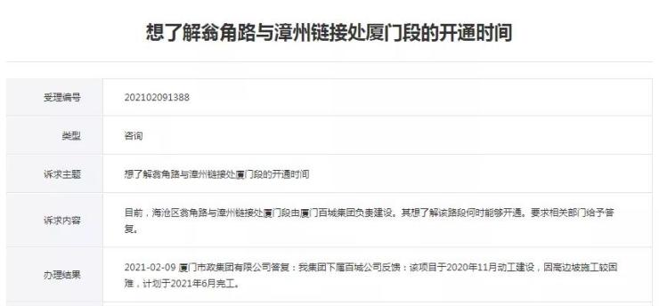 近日,有网友询问关于翁角路厦门段建设进展,表示目前海沧区翁角路与漳州链接处厦门段由厦门百城集团负责建设,想了解该路段何时能够开通。