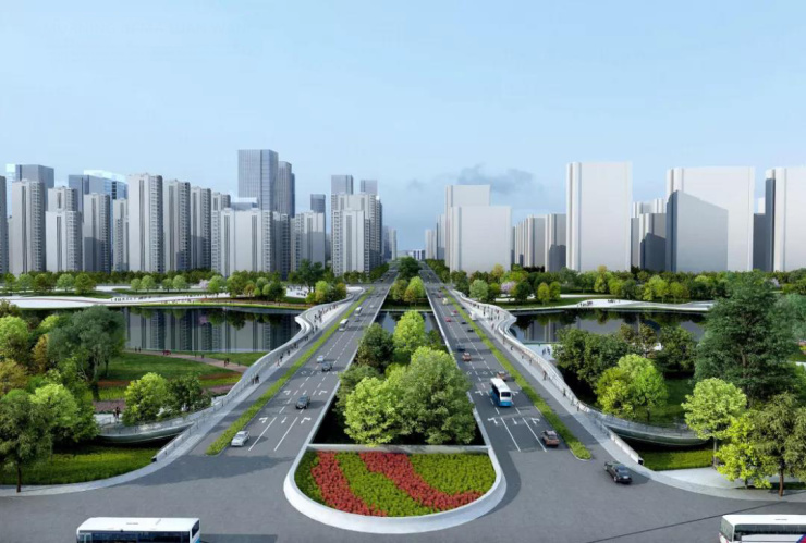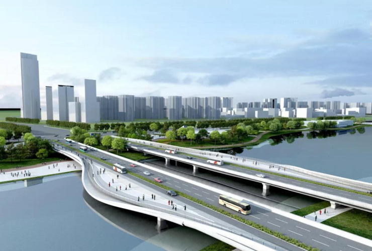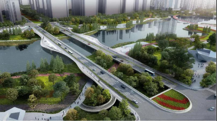 沿线设桥梁1座,长度291米,采用双幅连续箱梁形式,单幅桥面宽度18.75-33.75米。车行道采用沥青混凝土路面,人行道采用透水混凝土路面。