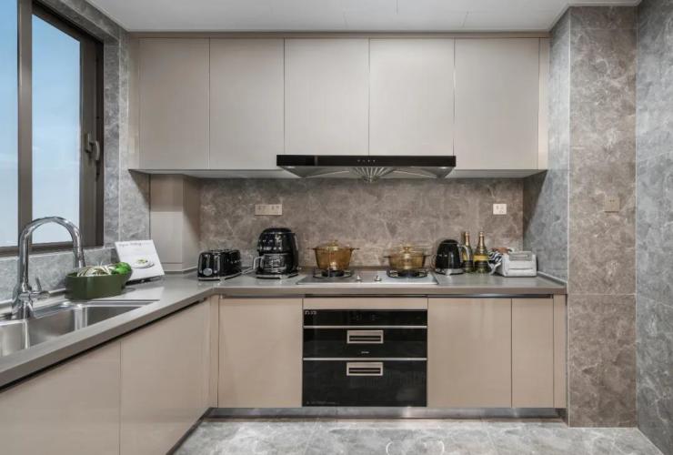 厨房量身定制的整体橱柜,分门别类收纳厨具及食物;品牌消毒柜,既能收纳又能消毒杀菌;加上国际一线品牌厨电、高抛式抽拉水龙头、水槽底板铝箔一体化,让烹饪环境干净、安全、便捷。