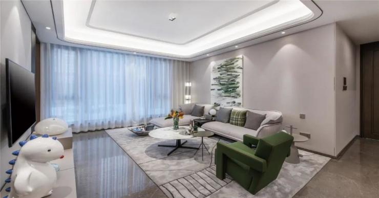 一键总控开关,离家、归家时一键操控所有照明。打开灯,进口大理石铺满客厅,肉眼可见的高级格调。