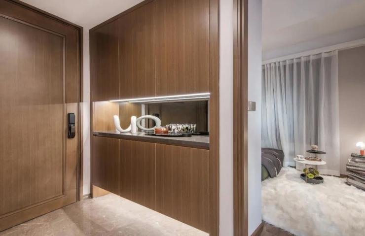 除了顶配精装,中骏天荟的收纳体系也可圈可点。例如进门时的玄关柜就设计了多个收纳分区,不同季节的鞋子分开收纳。