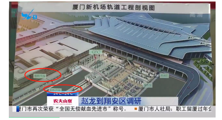 2021年2月4日下午,省委常委、市委书记赵龙到翔安区调研,现场察看新城规划建设情况。根据相关媒体对此的视频报道,可以清楚的看到,厦门新机场轨道工程剖析图以及新机场片区的较新规划图。未来机场航站楼外的GTC(交通中心),旅客乘坐轨道交通3、4号线来往市区和新机场。