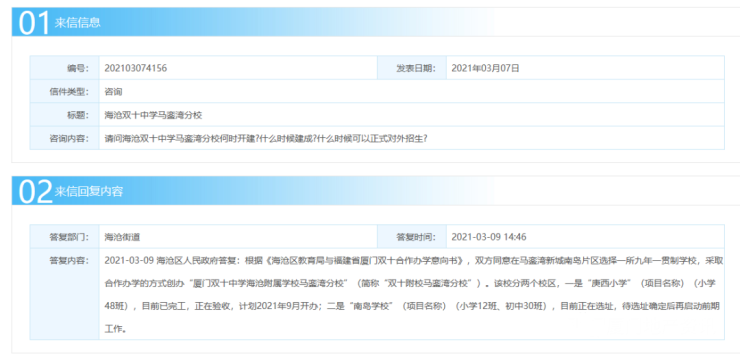 海沧区人民政府答复:根据《海沧区教育局与福建省厦门双十合作办学意向书》,双方同意在马銮湾新城南岛片区选择一所九年一贯制学校,采取合作办学的方式创办“厦门双十中学海沧附属学校马銮湾分校”(简称“双十附校马銮湾分校”)。