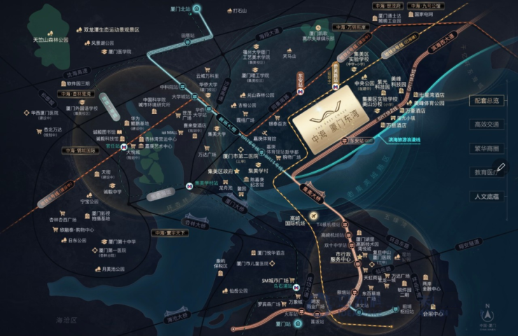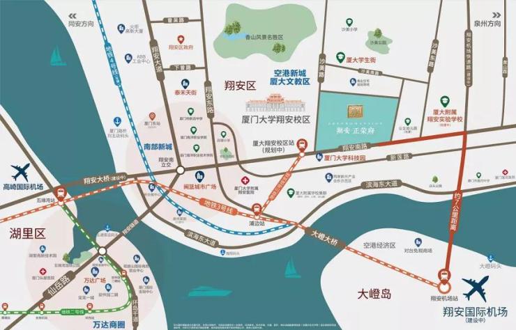 交通上,有翔安隧道口、第二通道(预计2022年完工)两条进岛通道,及地铁3、4号线等,未来该区还有国际新机场,多维交通,四通八达。