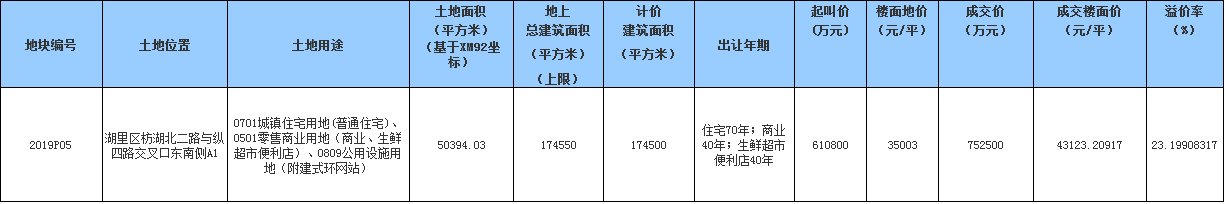 有建发、平安、中骏、深圳鸿荣源、恒兴集团(厦门长时)、金茂、厦门恒融晨7家房企参与竞拍,最终厦门恒融晨75.25亿竞得枋湖2019P05地块,成交楼面价43123.21元/平,溢价率23.2%。