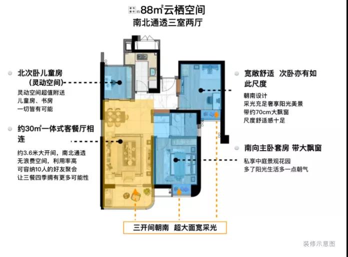 建筑面积约88㎡南北通透的舒适采光,餐客厅一体尽享宽敞的空间格局。同时次卧的灵动空间,能创造更多生活场景,它可以是享受亲子时光的儿童活动区,也可以是看电影、打电动的游戏屋。卫生间三段式分区空间规划,让家人洗漱、沐浴、如厕互不干扰,精琢的细节满足一家人的舒适生活。