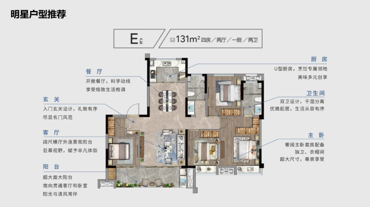 建面约131㎡四房作为改善界的王牌户型,实现了空间格局的全方面超越,约13.7米大开间,更是带给居者奢阔体验。
