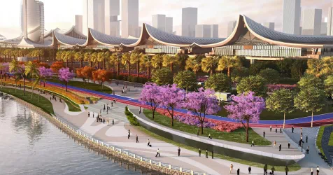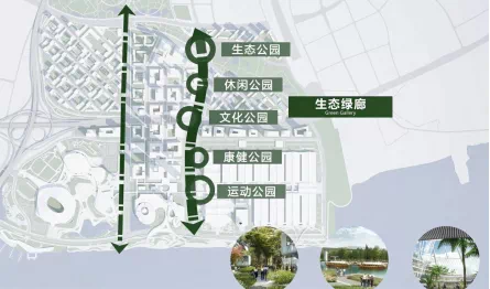 东部体育会展新城将建设22公顷城市绿廊和体育公园,以“城市之肺”体育公园为起点,沿城市绿廊,串联生态公园、休闲公园、文化公园、康健公园、运动公园,形成水绿相间、生态休闲、亲水乐水、风景靓丽的生态廊道。