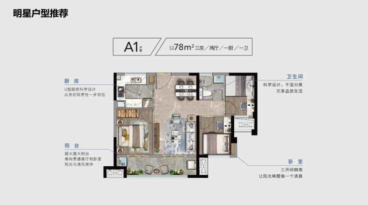 建面约78㎡三房两厅一卫是宝藏户型,也是性价比较高的一种。该户型方正,空间利用率较高。同时突破空间限制,做到三居的人性化尺度,几乎没有任何浪费空间。