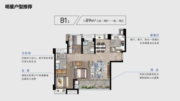 特别是,主卧套房带独卫和270°转角飘窗,相当拉风且能欣赏中庭美景。