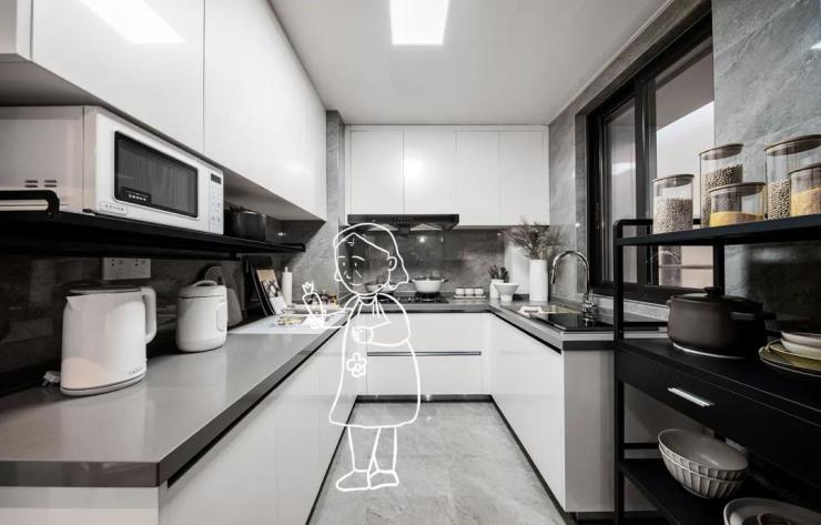 一个精致的厨房,凝聚着一个家的烟火气。宽敞明亮的厨房里自在烹饪,十八般厨艺尽显,U型厨房设计,大面宽操作台,烹调备料游刃有余,将浓烈的爱意烹调进这人间五味。