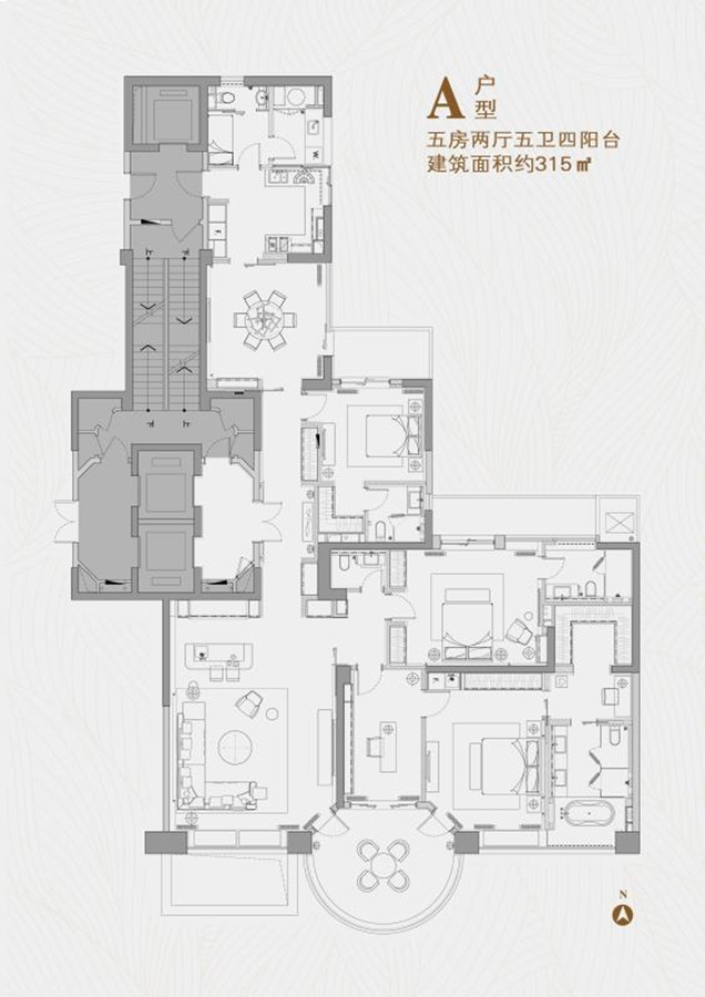 A户型建面约315㎡五房两厅五卫四阳台,纯粹大平层高端住区。