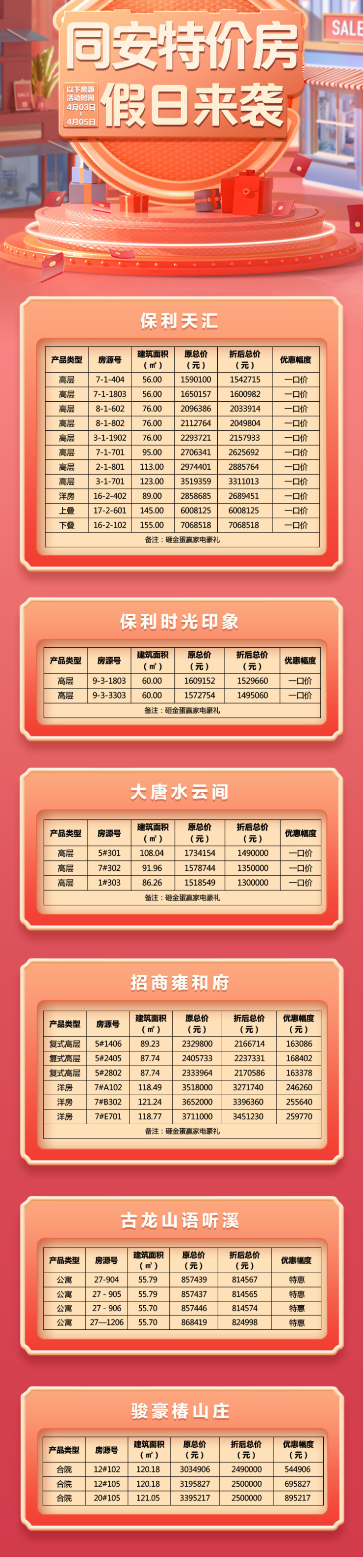 假日马上来到,在外打拼的你买到理想的房子了吗,现有一波福利等你到来,假期惊喜来袭,保利天汇、保利时光印象、大唐水云间、招商雍和府、古龙山语听溪、骏豪椿山庄特价巨献,好房不等人,一起来看厦门同安特价房假日来袭,6盘钜惠不容错过。