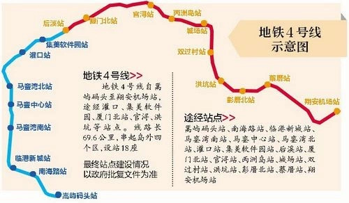 据悉,厦门地铁4号线规划为岛外环湾快线,是目前厦门地铁系统中“跑得较快”的一条线路,厦门市轨道交通4 号线规划为岛外环湾快线,线路全长约71.23km,共设站18 座。