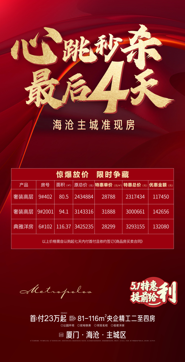 #五一特惠 提前给利#招商1872,惊爆房价,限时争藏,限时秒杀最后4天,手慢惠无,单价2字头起,海沧主城准现房,建面约81-116㎡央企精工二至四房。