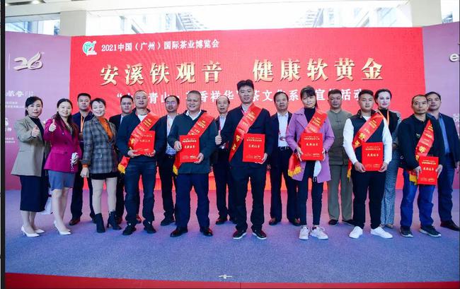 首届“观音铁韵 王者归来”杯秋季安溪铁观音茶王赛颁奖典礼在2021中国(广州)国际茶业博览会茶博会举行。作为2021中国(广州)国际茶业博览会(简称广州茶博会)、第二十二届广州国际茶文化节新闻发布会的配套活动之一,成为本届广州茶博会一大亮点。本次茶王赛历时一个月,评出清香型、浓香型特等、一二等各1名,三等奖和优质奖若干名,赛事单一奖项奖金达120000元,总奖金高达478000元。福建省政协民族和宗教委员会原主任、海峡两岸茶业交流协会副会长杨志英,福建省商务厅原副厅长、海峡两岸茶业交流协会副会长陈少和,福建省安溪县人民政府副县长洪天阳出席活动并为获奖者颁奖。