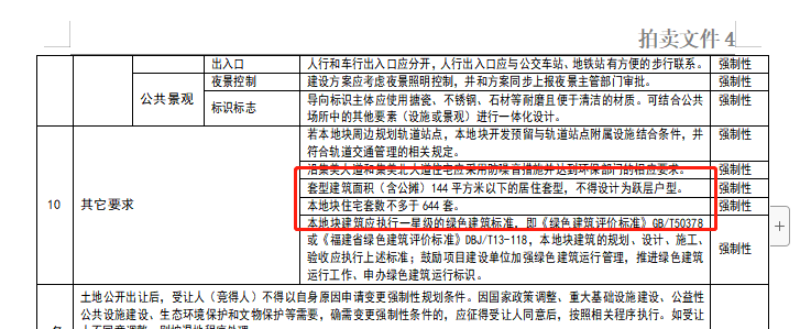 同时,该地块同样要求建筑面积144平方米以下的居住套型不能做复式跃层户型。需要注意的是,本地块住宅套数要求不得多于644套,平均每套面积约89平左右,这就要求该地块无法做太多小户型产品,大体上还是以2-4房的户型为主。