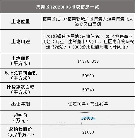 本次出让的集美J2020P03地块位于集美区11-07集美新城片区集美大道与集美北大道交叉口西侧,隶属于集美北站片区。出让的土地面积约为2公顷,地上计价建筑面积59740㎡,起拍总价12.6亿元,商品住宅部分起始楼面价约为21000元/㎡。