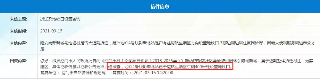 官方回复:“经核查,地铁4号线彭厝北站已于厦航生活区东侧400米处设置地铁口。”