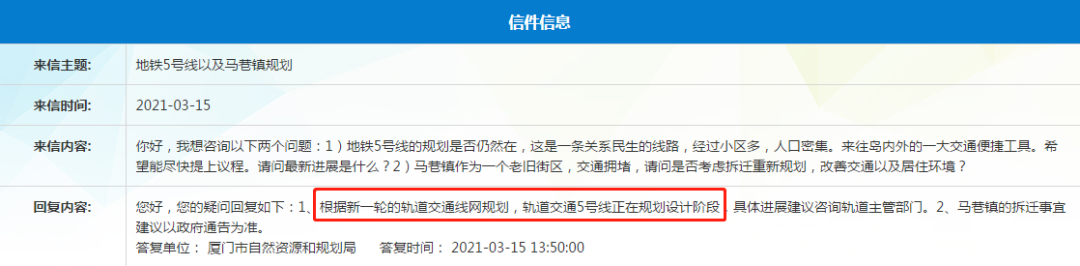 官方回复“根据新一轮的轨道交通线网规划,轨道交通5号线正在规划设计阶段。”