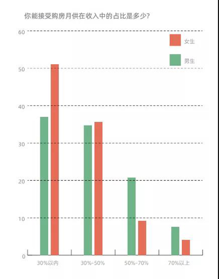 而在买房的压力方面,女性更重视房贷能力。《2021年女性购房报告》显示,过半女性受访者对月供的承受能力在收入的30%以内。男性对月供压力上的忍耐力明显高于女性,20.76%的男性可以承受月供占收入的五成至七成,而女性对这两项的选择占比仅为9.18%。