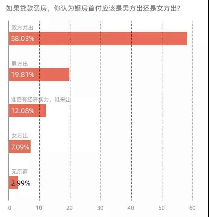 一直以来,男性结婚买房压力都很大。不过呢,在调查中,“双方共同出资”成为女性主流态度,58.03%的女性认可双方共同完成首付。19.81%的女性认为买房首付款应由男方出资,7.09%的女性认为可以女方自己来付首付,也有12.08%的人觉得谁更有经济实力,就由谁来出首付款。