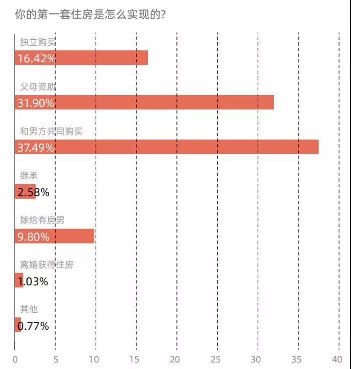 根据研究院调查结果显示,在受访女性群体中,37.49%的女性通过“和男方共同购买”拥有首套住房,31.9%的女性买排名前列套房需要“靠父母资助”。
