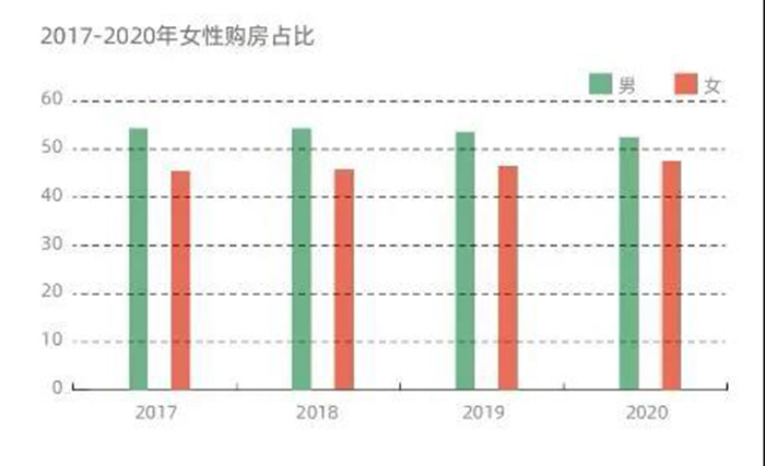 根据报告显示,全国30个重点城市整体女性购房占比从2017年45.60%到2020年47.54%,逐年提升,一路走高。
