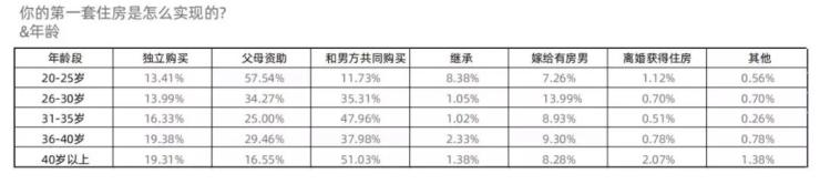 越年轻所需父母资助越多,不过,随着年龄的增长,越来越多的人独立实现置业梦。数据显示,36-40岁独立购买首套房的女性占比达到19.38%,较20-25岁高出5.97个百分点;而20-25岁需父母资助买房的占比高达57.54%,超出40岁以上近41个百分点。
