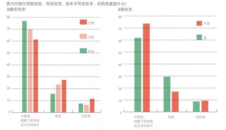 不过,在房产证上署谁名字也是另一个关注焦点。根据研究院调查,在“男方付首付贷款买房,共同还贷,房本不写你名字,你的态度是什么?”这一问题上,67.81%的受访女性表示“不接受”,认为婚后房产是双方共同财产。