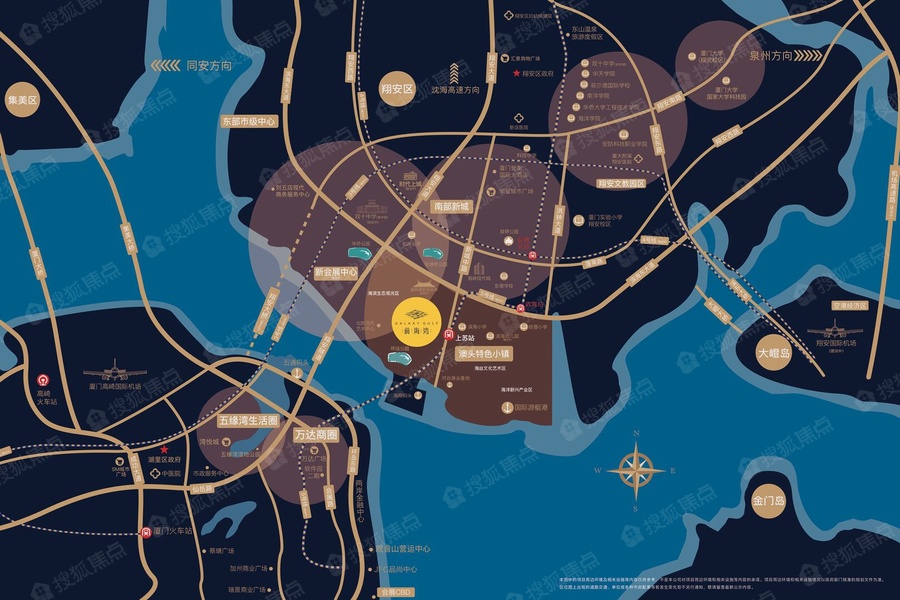 位于项目北侧的滨海东大道,是一条贯通南北的主干道,向西可与翔安隧道相连到达岛内,向北可到达同安、集美;未来国际机场建成,可通过大嶝大桥直接到达机场;规划的地铁5号线上苏站点,与项目咫尺之隔,可连通岛内会展片区与大嶝岛;也可在彭厝北站换乘4号线,通往同安、集美、海沧等地;根据厦门地铁远景规划,未来翔安有7条地铁通过,将是厦门地铁最密集的区域。